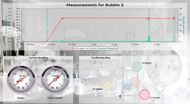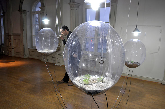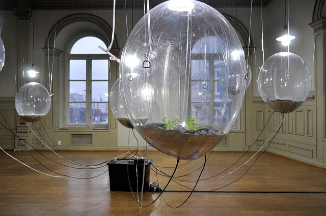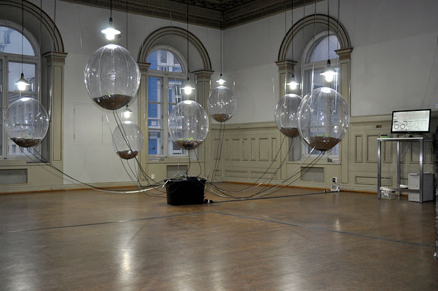 Inspired by a modular concept, the "LSS (Life support System) is a hydroponics system for plant cultivation. It comprises of seven spheres, in which selected edible plants are inserted. Collected water is pumped and then drained creating a circular system for delivery of nutritional solution. Each sphere has three intakes and one drain. One intake (an air pump) supplies constant air at low pressure to keep the sphere in shape, another provides nutritional solution and a third one allows visitors/participants to breathe into it, feeding the plants with Co2. In return the plants produce oxygen and food beneficial to human health. Computer software especially developed for this piece controls all functions of this self-contained system, displays current readings of oxygen and Co2 levels and collects data over time. LSS installation emphasizes our dependence on nature for keeping us alive and points to a symbiotic relation we have and must nurture. In my installation the well-being of plants depends on participants ‘donation’ of Co2. <