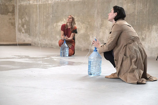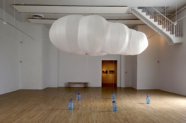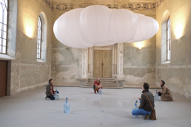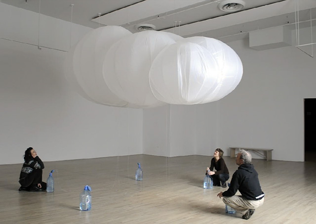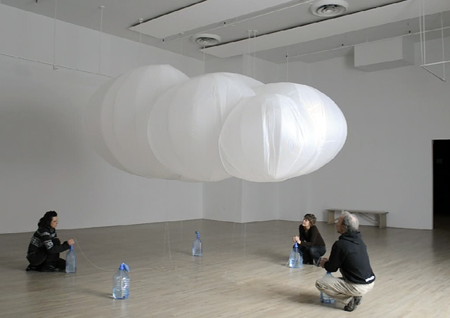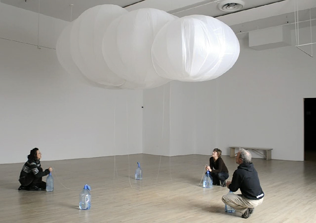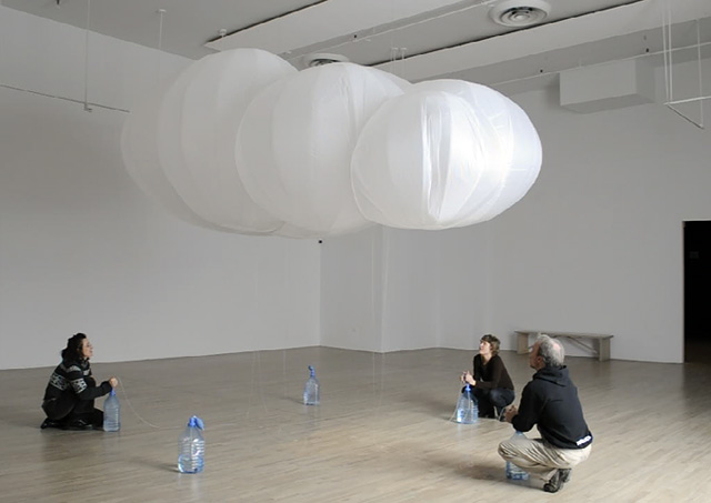 The Cloud involves a large cloud-shaped structure with four inner bladders filled with helium allowing the object to float in the air. Using multiple tubing and small hand pumps with one-way valves, people are able to push water from bottles underneath to an invisible water contraption compartment inside the cloud. Collected water adds to the weight of the object and The Cloud descends. When water overflows, The Cloud “rains” becoming lighter and thus ascends. <
