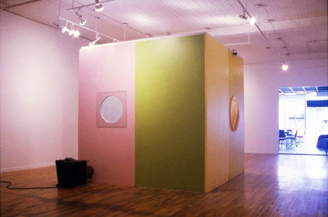 An 8-foot meteorological balloon was inserted in an enclosed, semi-airtight cube (8 x 8 x 8 feet). When a viewer approached the cube, a motion detector triggered the blower that was sucking the air out. A negative pressure inside the cube caused the balloon to inflate, allowing a person to climb inside through the round opening and experience the sphere. <