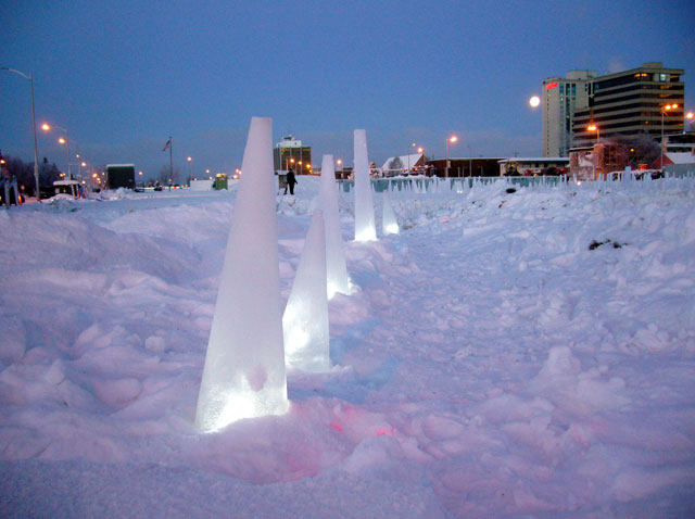 The Ice Fracture transformed the winter phenomena of ice cracking into an urban experience that explored the physical relation between movement, light and space. 400 casts of traffic pylons covered a 100x200 ft. area of the Delaney Park site in Anchorage, Alaska. Embedded in the ice, LED lights were controlled by strategically placed motion detectors, which visitors triggered by their movement. The lines of lights and their arrangement referenced the idea of ice cracks that happen when one walks on a frozen lake. Ice Fracture was created for the FREEZE event curated by Julie Decker and organized by Alaska Art Forum and Anchorage Museum. <