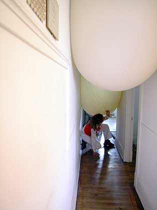The disorienting experience of mobility and instability helps to re-examine the dwelling's definition as a place of belonging where identities are forged. This site-specific installation pursued this investigation by inviting people to interact with sounding-balloons residing in a private apartment space. Flexible and formless, like shapeless zones of presence, the balloons took possession of the rooms, occupying them completely, blocking doors and windows, or simply floating within the space. This intrusion metaphorically evoked the presence of a foreign body in one's own living space and brought our attention to the question of positioning and seeking claim to a place. <