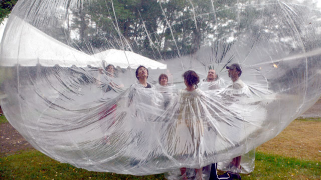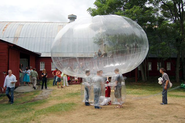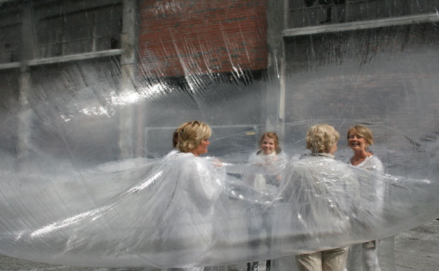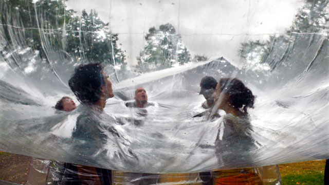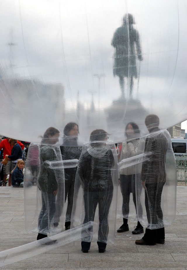 At any given moment of time five people are needed to inflate the structure. While the bodies of participants are squeezed and immobilized between two layers of clear vinyl, their heads can move and talk inside the inflated bubble. The duration of the piece depends on the five people’s agreement to end it, as no one can leave on his/her own accord. <