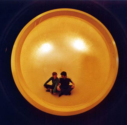 An 8-foot meteorological balloon was inserted in an enclosed, semi-airtight cube (8 x 8 x 8 feet). When a viewer approached the cube, a motion detector triggered the blower that was sucking the air out. A negative pressure inside the cube caused the balloon to inflate, allowing a person to climb inside through the round opening and experience the sphere. <
