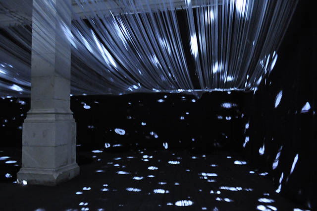 Misty Way is a video installation that incorporates three main elements involved in fog collection: humidity, wind and a harvesting substrate. In this piece, water droplets in fog are filmed with a high magnification camera that turns each droplet into a visible, light circle oscillating to its own rhythm. Metamorphosizes into light drops, they are collected by a textile net made from parallel fibres. One hundred and twenty kilometres of threads, walked and stretched one by one, create an inclined surface covering the entire ceiling of the room that ‘captures’ the light drops through screens, casting a second projection on the floor covered in dark carpet. These drops of light create an immersive environment where visitors are literally splashed by a fog of light, shadows and sounds - a musical composition that in itself is a space reconstruction of stitched noises recorded by Daniel Schorno (electronic music composer) during lab experiments.