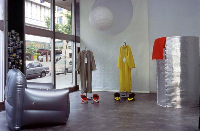 The Uniblow Outfits consisted of two inflatable outfits made from double layer of rubber latex and shoe-pumps (adaptation of foot pumps used for mattresses), which people were invited to try on and walk around in order to inflate themselves. Displayed in a set-up resembling a fashion boutique, this work investigated strategies used in fashion and advertisement, namely desire and fantasy projections to see how they influence our understanding of the body, comfort and discomfort. <