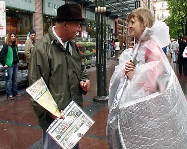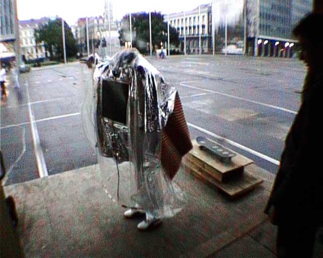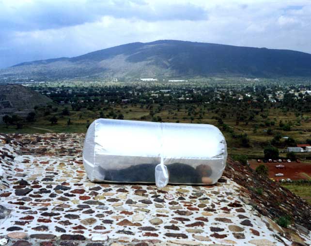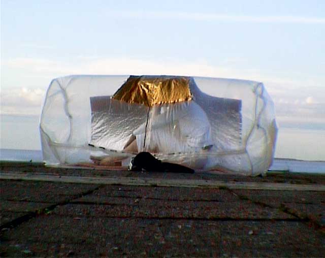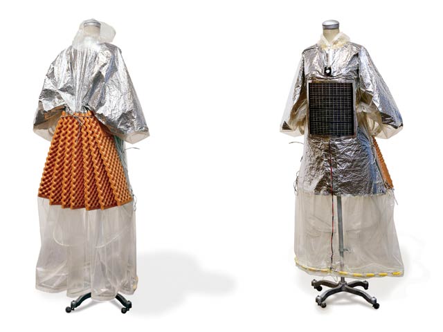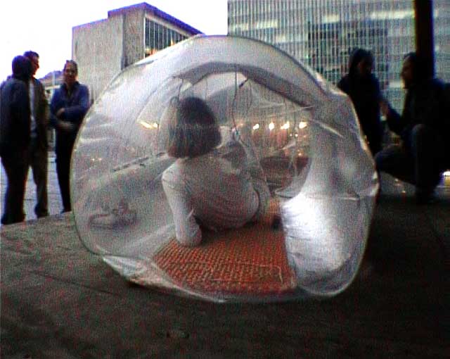 The SleepingBagDress prototype involves a multipurpose kimono-dress that when inflated changes into a cylindrical container inhabitable by one or two people. The SleepingBagDress prototypes operate on a small computer fan powered by a rechargeable lead battery (prototype 1) and NiMH batteries charged by a solar panel incorporated into the dress itself (prototype 2) and looks at the portability and self-sustainability of a wearable cell, comfortable as both, a dress and a temporary shelter. The SleepingBagDress prototype was used in walking performance in Mexico City (Mexico 2003), Toulouse (France 2004), Brussels (Belgium 2004) and as part of the 2004 International Symposium of Electronic Art (ISEA) in Tallinn (Estonia). It won an honorable mention in the Palm Mobility contest and was featured in Air Canada’s enRoute magazine in October 2007. <