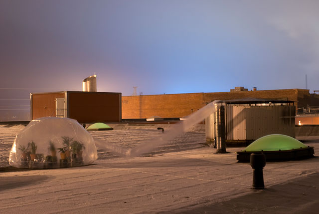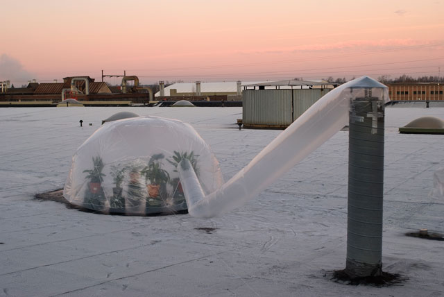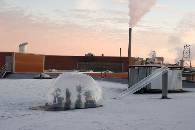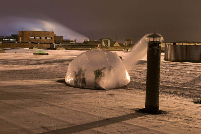 Air Cleanser was installed on the roof of the Rosenlew Factory in Pori in December, 2008. It comprised of a geodesic dome inflated by one of the roof’s ventilators. The warm (and yet toxic) air coming from the vent created a suitable temperature for placing houseplants over the period of 24 hours. According to NASA research the selected plants were absorbing factory pollutants and adding a small amount of “fresher” air into the environment. <