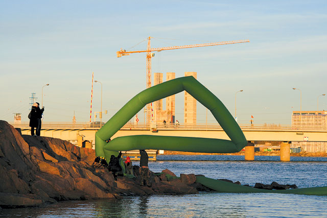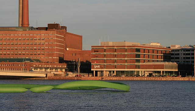The Green Line Project involved experimentation with a 350m inflatable line made from the biodegradable material ‘Bioska’ that stretched over water from Lauttasaari Island toward the Cable Factory on the mainland (Helsinki) and visually represented a link from one side to another. The Green Line Project was a landscape drawing proposition and was inspired by my daily bike trips between Espoo and Helsinki over the Lauttasaari bridge that stood for the mid point of my journey and gave me a particular sense of being ‘there’, either in Helsinki or Tapiola depending on the direction of travel. <