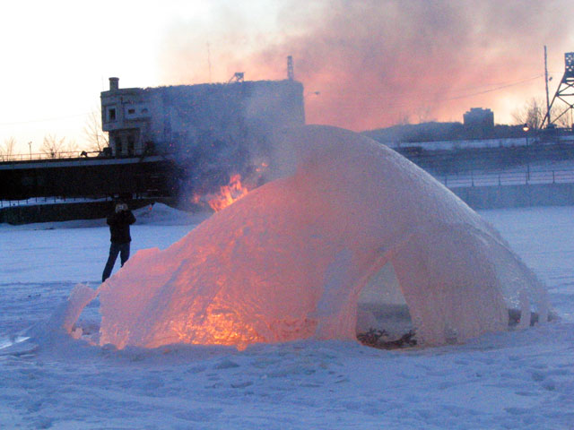 A parabolic in shape inflatable structure was constructed and used as a form for the build-up of ice. A spray of mist, from the low-pressure nozzles inserted into the inflatable shape and supported from the inside by an infrastructure of flexible tubing, allowed for a natural formation of ice on the surface. Water was pumped directly from the canal and when the ice layer was shaped (overnight 8-10 hours) the form was deflated, taken out and moved to a new location in order to start the process again, leaving a transparent ice-shell behind. The colony of ice domes referenced the ideas of nomadic and hypothetical dwellings with qualities of solitude and isolation rarely experienced in city centres. <